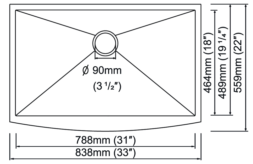 HA3322F10 33 in (838mm) x 22 in (559mm) x 10 in (254mm) Apron Single Bowl 3322 HA3322F10 Features Stainless Steel SUS 304 Thickness: Gauge 18 Hairline Finishing Powder Coating underneath of the bowl Drawing: Back HA3322F10-Specification