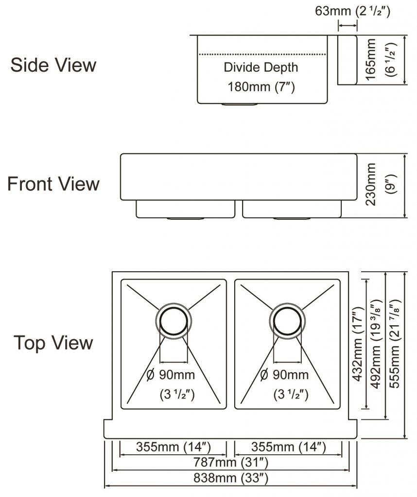 HAF3322C9 33 in (838mm) x 21⅞ in (555mm) x 9 in (230mm) Apron Single Bowl 3322 HAF3322C9 Features Stainless Steel SUS 304 Thickness: Gauge 18 Hairline Finishing Powder Coating underneath of the bowl Drawing: Back HAF3322C9-Specification